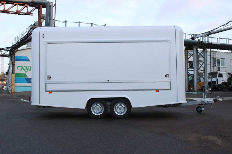 Прицеп изготовлен по усовершенствованной технологии с изменением аэродинамических характеристик, предназначен для торговли продуктами питания или промтоварной продукцией. Может быть доукомплектован торговой мебелью, холодильным оборудованием, оборудованием под фаст-фуд. Наружняя и внутренняя обшивка - пластик.