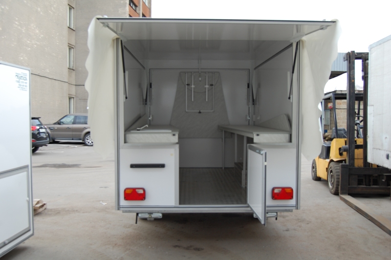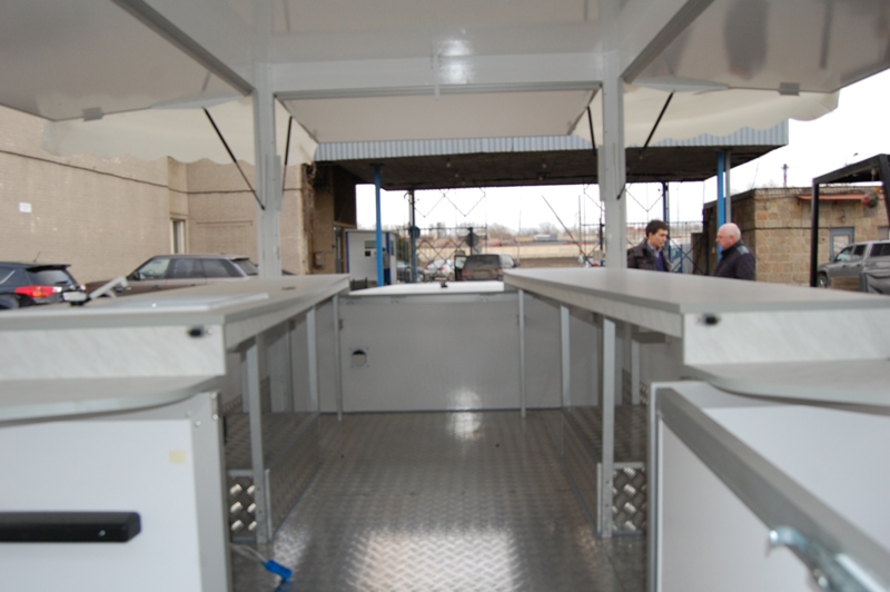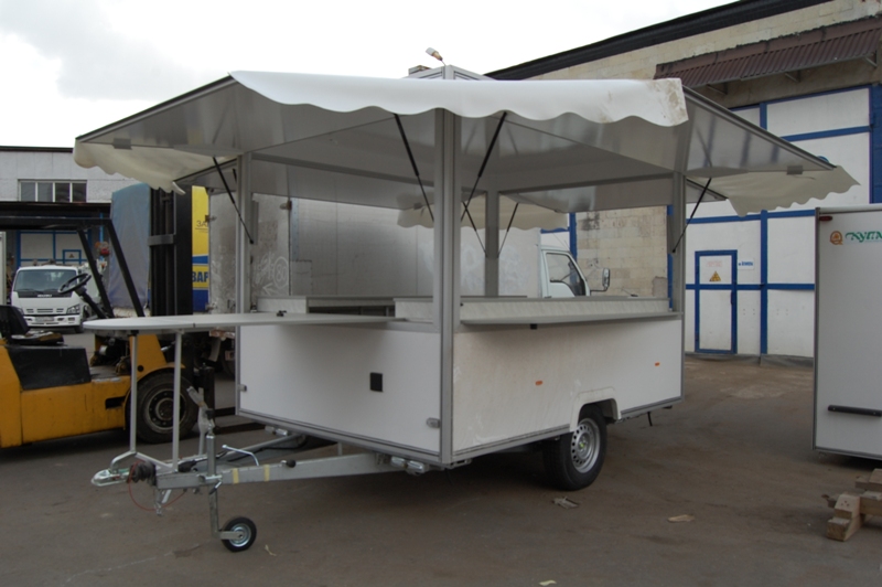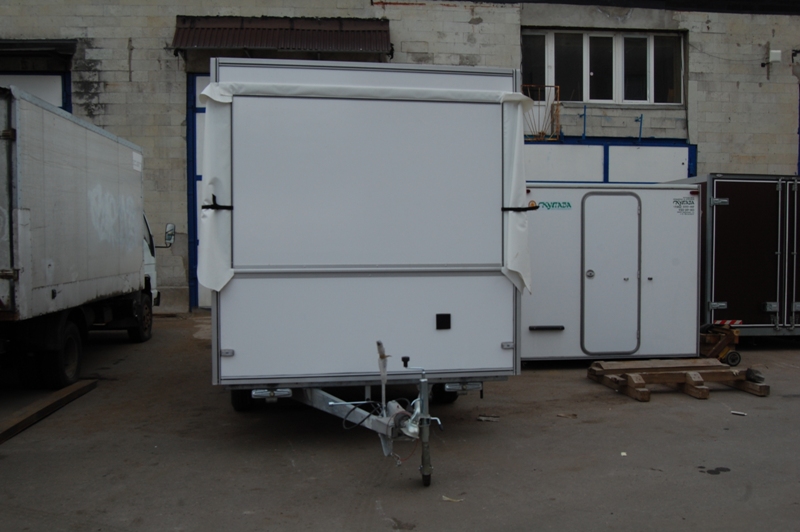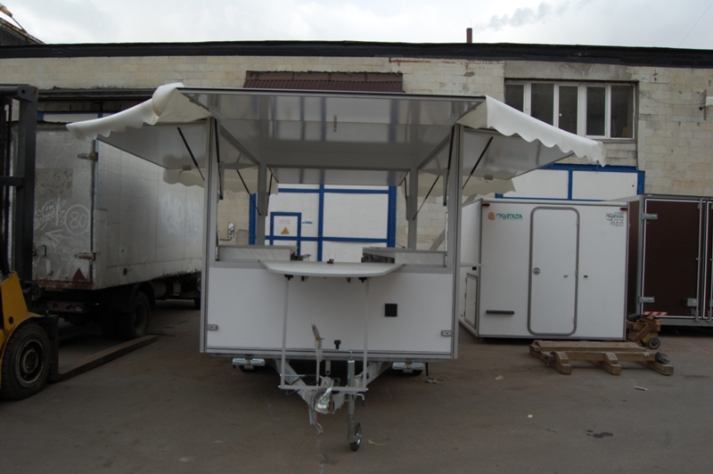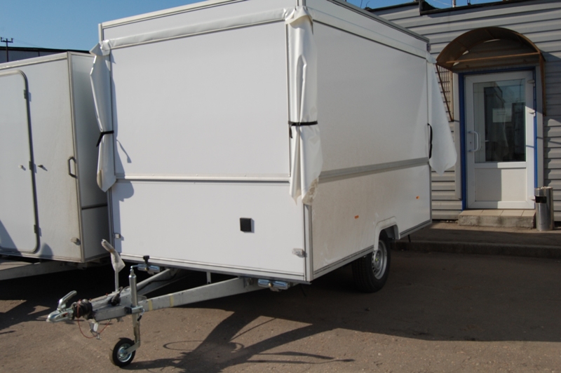 Одноосный торговый прицеп для розлива напитков "Купава" 813225 площадью 8 кв.М имеет 4 ставни и внутренние габариты Д[3,2] х Ш[1,9] х В[2]М, достаточные для удобной организации двух рабочих мест. Прицеп оборудован торговой мебелью и электрощитком, имеет внутреннее освещение. Удобный раскладной навес обеспечивает дополнительные удобства для ведения торговли в любых погодных условиях.